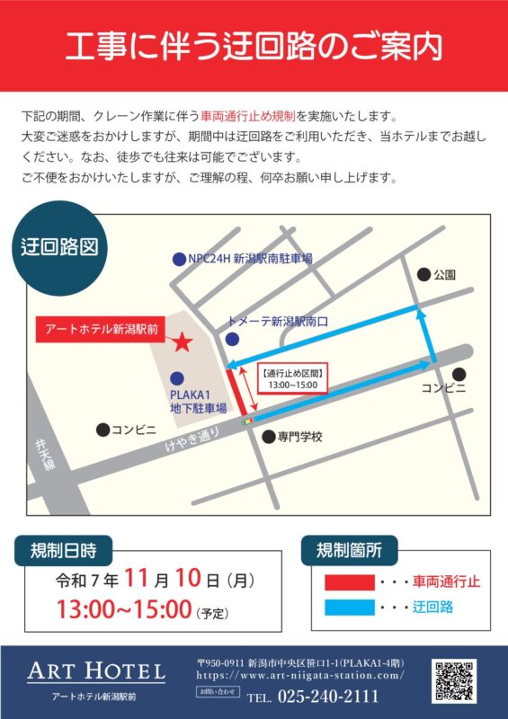期間中は迂回路をご利用いただき、当ホテルまでお越しください。
