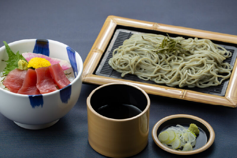 ハーフ蕎麦と3種類のミニ丼(鮪丼・ヒレたれかつ丼・海老天丼)を選べるセットです。