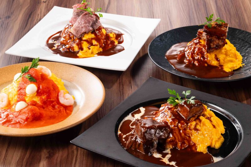 ふんわりと仕上げた卵に、ジューシーなお肉やローストビーフを贅沢にトッピング。